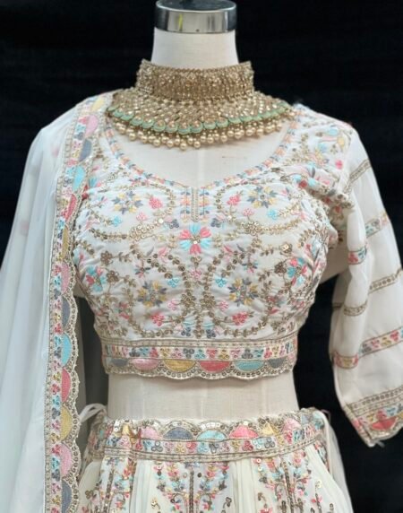 Elegant ivory lehenga set featuring intricate multicolor embroidery, delicate sequin work, and a graceful sheer dupatta. Designed with a flattering silhouette and fine craftsmanship, perfect for weddings, festive occasions, and special celebrations.