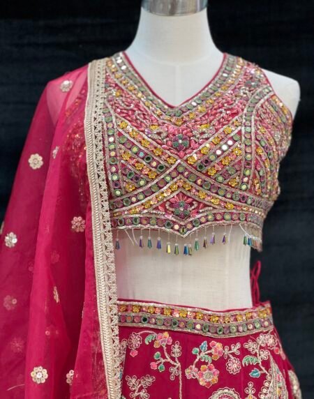 Striking red lehenga set adorned with intricate multicolor embroidery and delicate sequin detailing, paired with a graceful sheer dupatta. Designed with a flattering silhouette and rich craftsmanship, perfect for weddings, bridal functions, and festive celebrations.