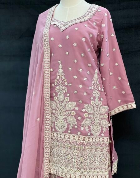 Elegant long shirt lehenga set featuring delicate floral embroidery, a beautifully detailed hemline, and a sheer dupatta with embroidered borders. Designed in a soft rose-pink tone, perfect for festive occasions and formal celebrations.