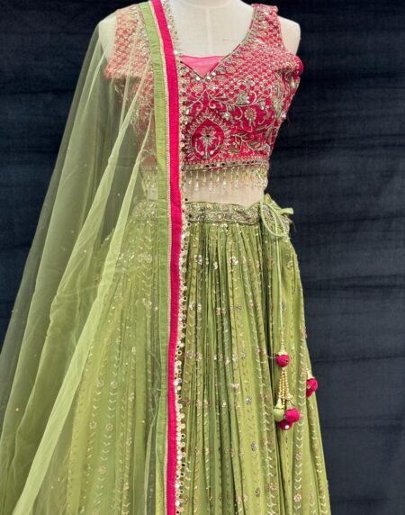 Elegant georgette lehenga set featuring intricate hand work and machine work, paired with a richly embroidered contrast blouse and a lightweight dupatta. Designed for a graceful, festive look perfect for weddings and celebrations.