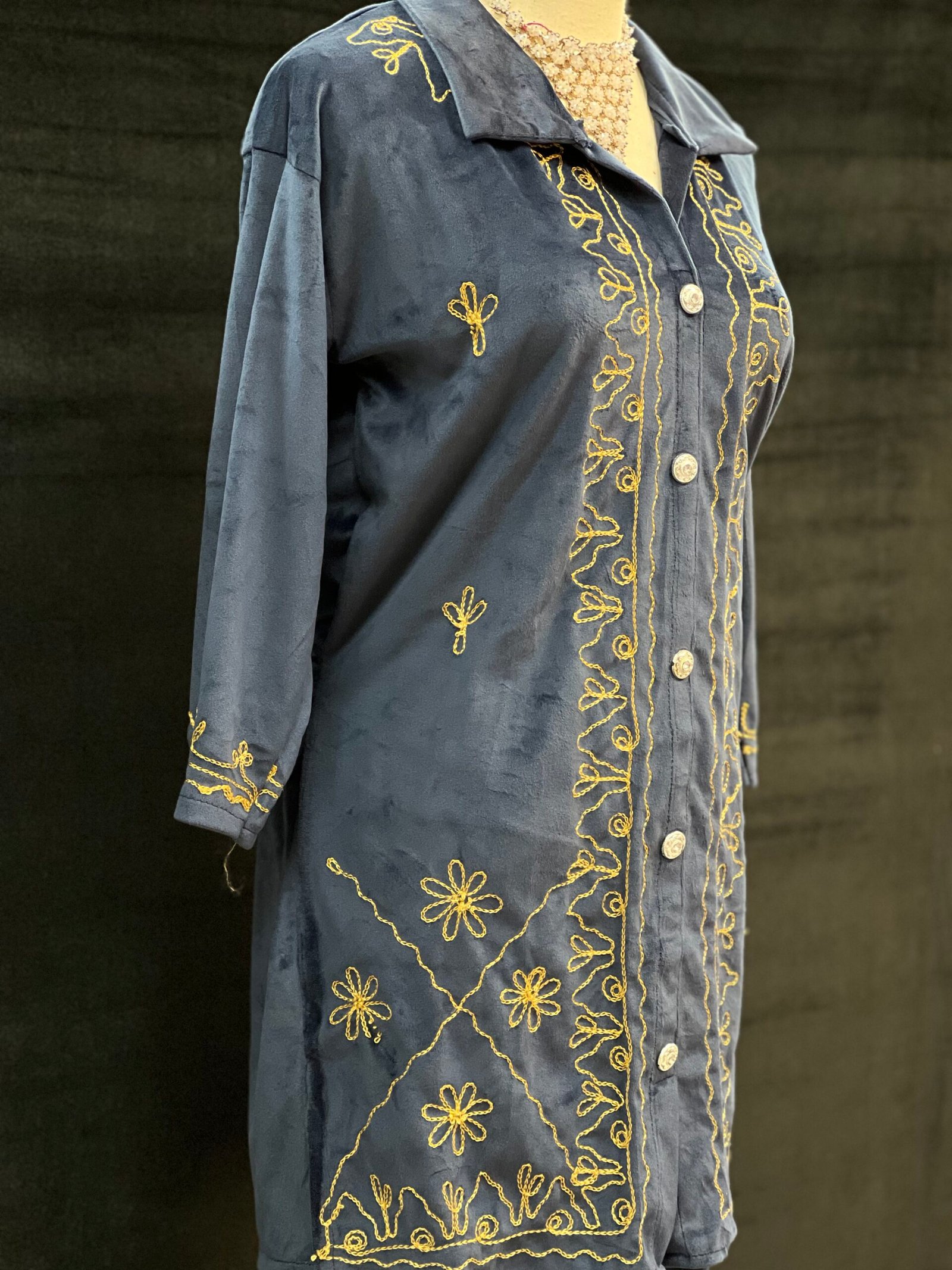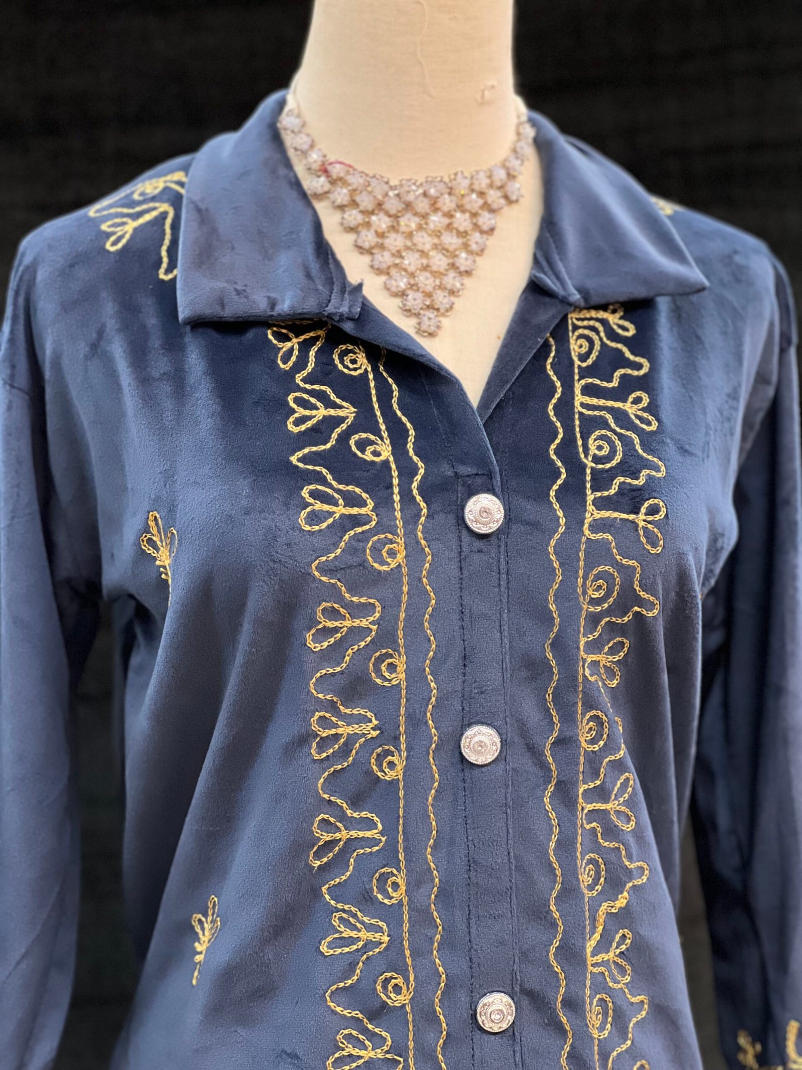 This cord set features a relaxed shirt paired with matching pants, designed with subtle yet elegant embroidery throughout. The shirt has a clean button-down front with detailed thread work running along the placket, sleeves, and hem, giving it a refined handcrafted look. The embroidery adds character without overpowering the outfit, making it easy to wear for both casual and semi-formal occasions.