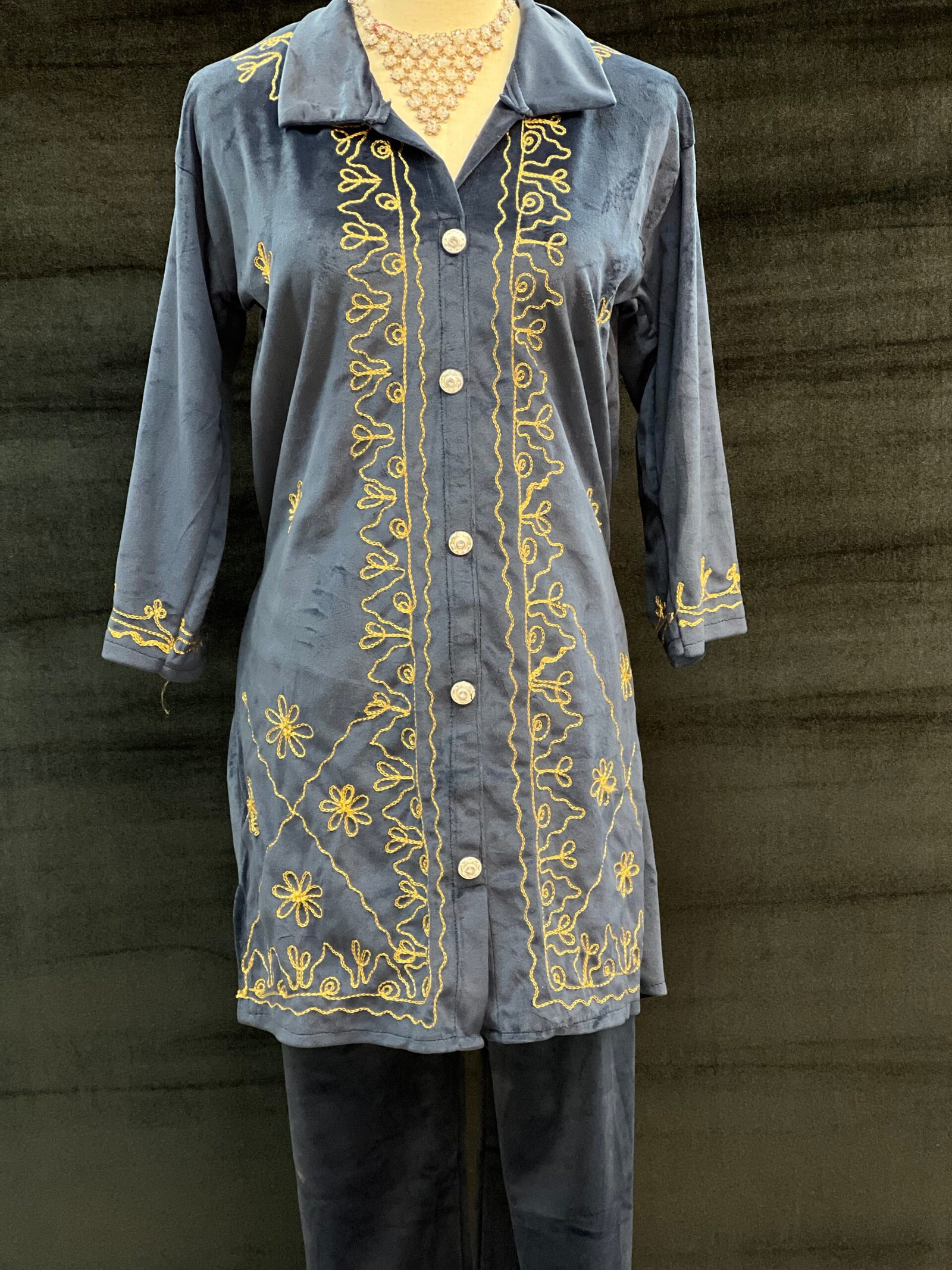 The fabric feels soft and comfortable on the skin, allowing easy movement while maintaining a structured silhouette. The matching pants complete the set with a balanced and coordinated finish, making the outfit look put together with minimal effort. The overall design is modern with a touch of traditional detailing, perfect for those who like understated style.