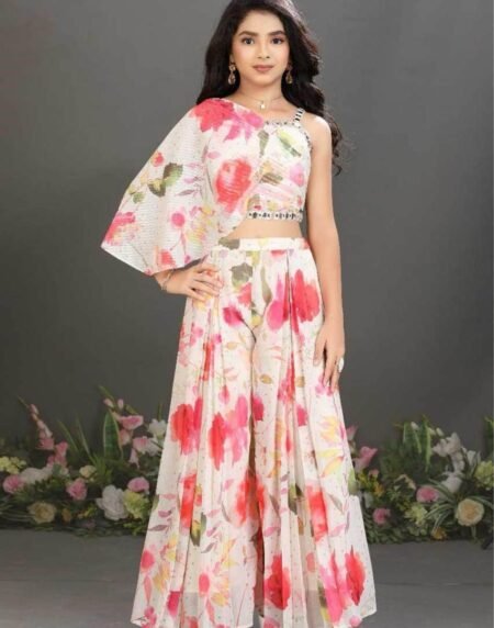 This kids saree set features a beautifully draped saree paired with a sleeveless embellished blouse, creating a graceful and traditional look for special occasions. The blouse is detailed with geometric embroidery that adds a festive touch while keeping the design neat and elegant. The saree is lightweight and flows comfortably, making it easy for kids to wear and move around in.