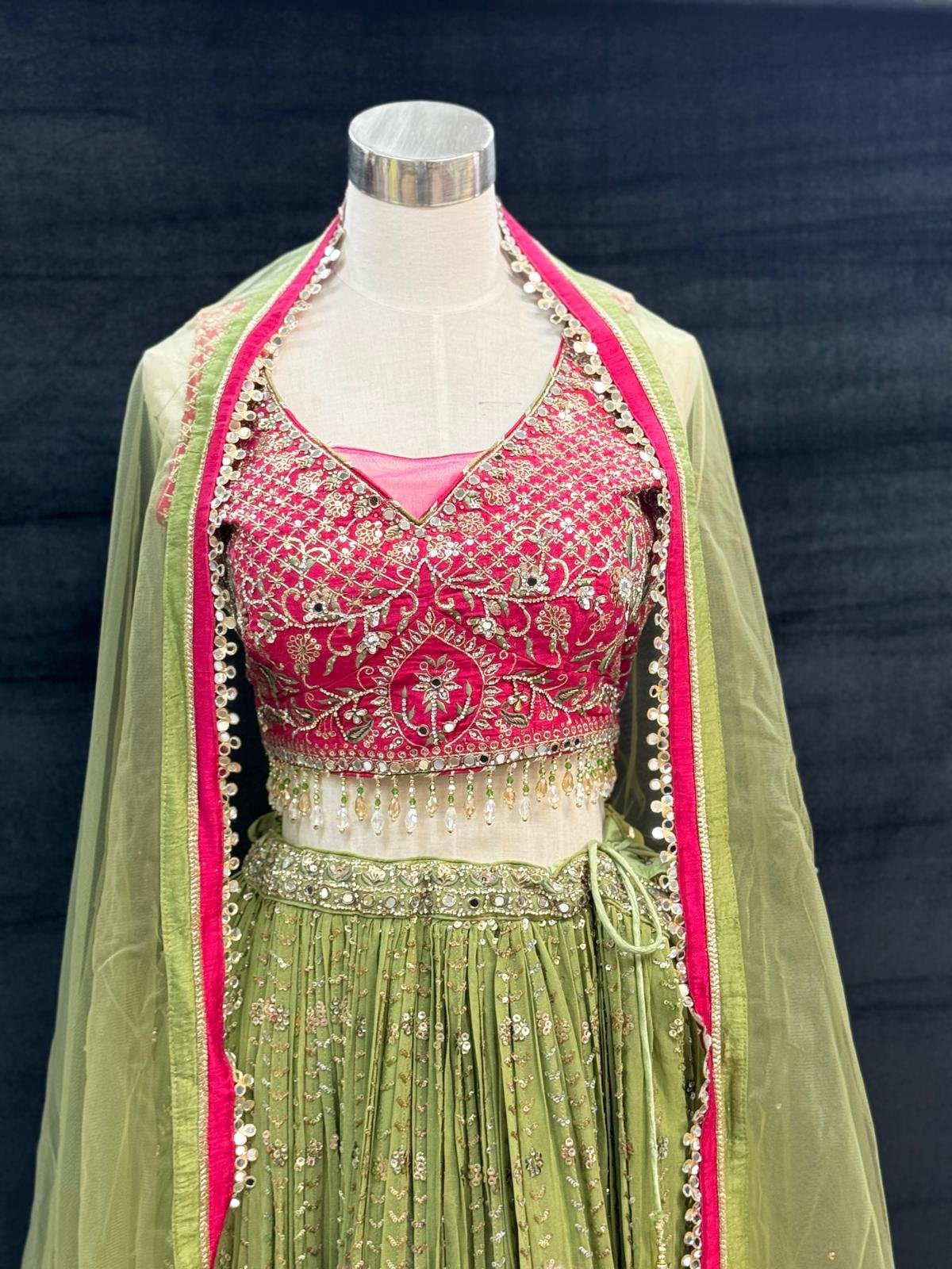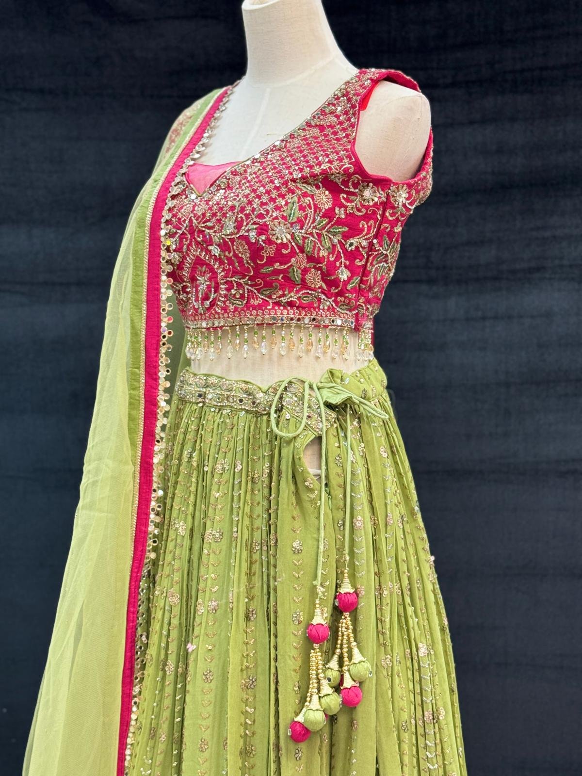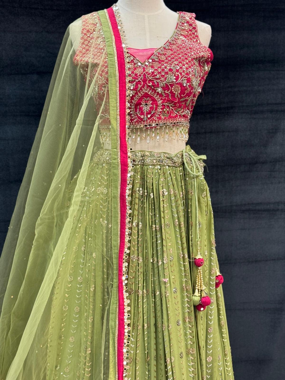 Hand-Embroidered Georgette Lehenga Set with Contrast Blouse & Dupatta
