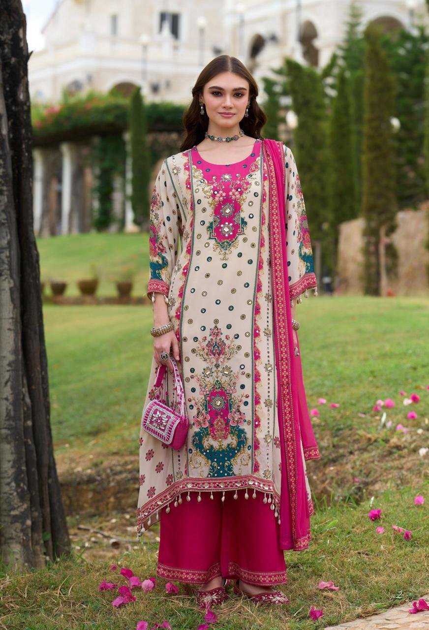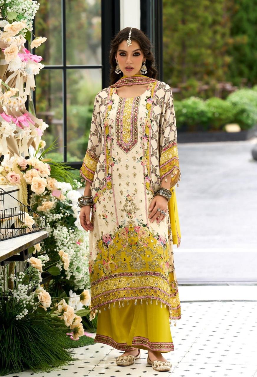 This kurta set features detailed embroidery and mirror-style work that gives it a rich and elegant look. The kurta is designed with intricate patterns on the front, sleeves, and hem, creating a balanced mix of traditional and modern style. The fabric feels light and comfortable, making it suitable for long wear during functions and gatherings.