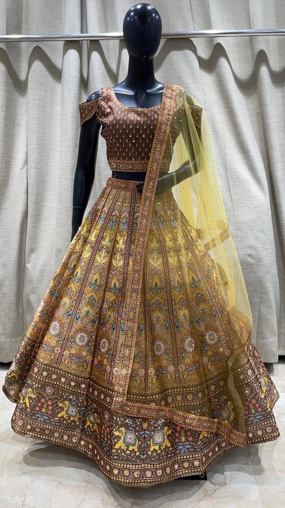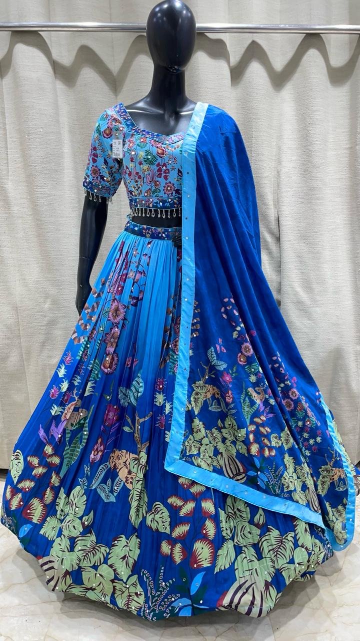 This lehenga choli set is designed with detailed traditional prints that give it a rich and elegant look. The lehenga has a wide flare that falls beautifully, making it perfect for weddings, functions, and festive occasions. The fabric feels comfortable while still looking heavy and premium, ideal for long wear during events.